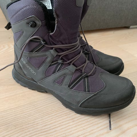 Pæn Salomon vinterstøvler i størrelse 44. Støvlerne er designet til vinterbrug med isolerende materiale og robust sål for bedre greb på glatte overflader. Sorte og grå i farven med blåt logo. Fremstår nærmest som nye. Velegnet til udendørs aktiviteter i koldt vejr. Sender gerne.