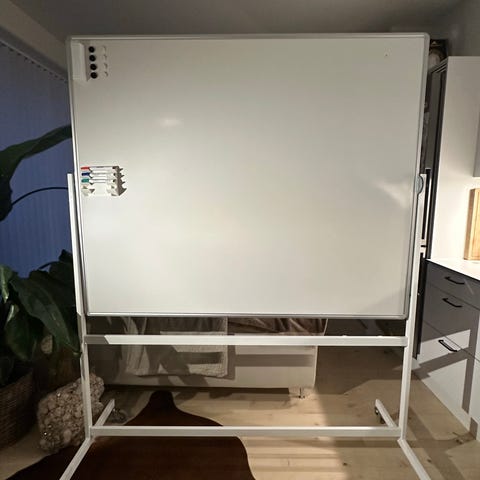 Der er rester af klisterbånd på kridt- og opslagstavlen, som ses på billederne. Whiteboard-siden fungerer som den skal. Tavlen fremstår brugt med almindelige kosmetiske spor, men er fuldt funktionsdygtig og klar til brug.