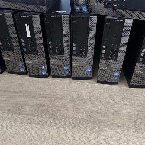 Dell OptiPlex stationær computer med kabinettet åbent, viser interne komponenter som bundkort, harddisk og strømforsyning. Sort kabinet med frontpanel, der indeholder porte og drevplads. Velegnet til kontorbrug eller generel computeranvendelse.