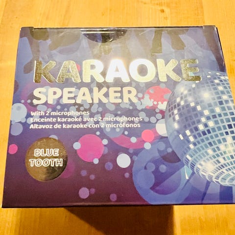 Karaoke Speaker sæt bestående af trådløs mikrofon og højttaler i guld farve med dekorative nitter. Mikrofonen har knapper til betjening, og højttaleren har kontrolpanel med flere funktioner. Sættet er designet til karaoke brug og trådløs tilslutning.