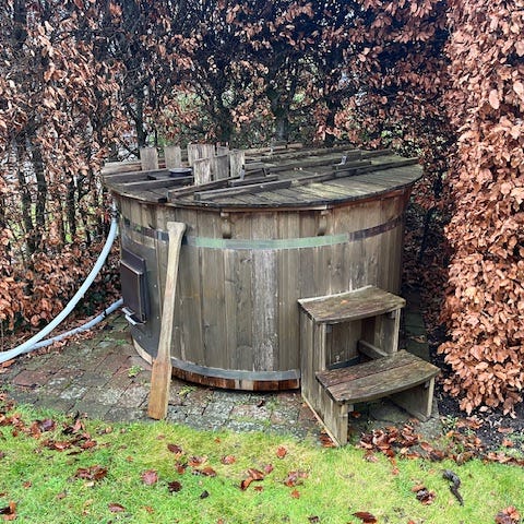 Brugt Vildmarksbad til 4-6 personer. Det gode er at der er udvendig ovn. Udstyret med en brændeovn til opvarmning. Inkluderer en lille træstige for nem adgang. Der med følger overflade skimmer. Vildmarksbadet er Ø160 der med følger pH måler med og produkter med til vandet. Der er også en lille serverings bakke der kan hænges på siden til drikkevare.