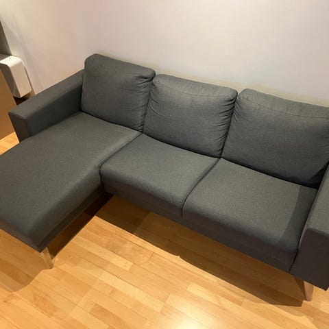 Mørke grå stof sofa med chaiselong. Den er et år gammel og har ingen slid mærker.