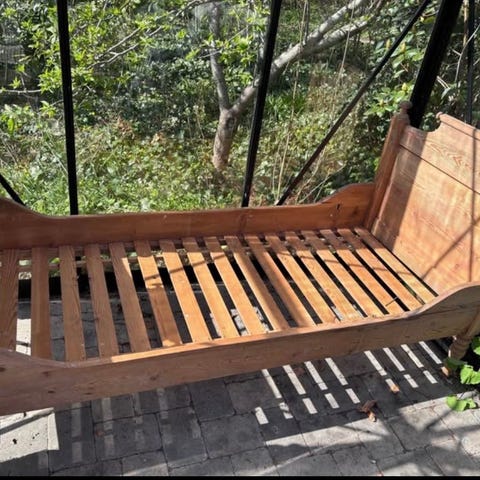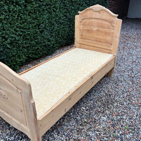 Gammel fin afsyret karlekammerseng med udskæringer i begge gavle.