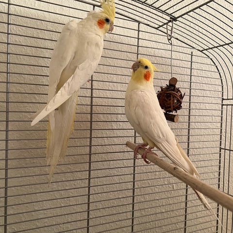 To smukke og unikke hun nymfeparakitter. De er tamme begge to og elsker at blive nusset i nakken. De er ringmærket begge to og du kan derfor registrere dem hos din dyrelæge.