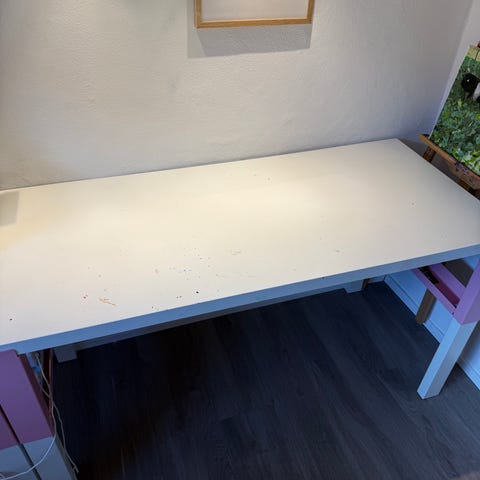 IKEA børne skrivebord og stol i hvid og lyserød. Sættet består af et skrivebord med få brugstegn, se billeder. Samt en tilhørende kontorstol med hjul, som har utydelige pletter.. Designet til børn og egnet til brug i børneværelser til leg, lektier og andre aktiviteter.