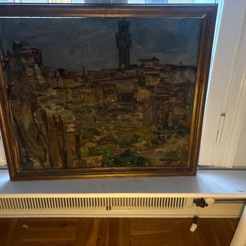 Oliemaleri på lærred med guldfarvet ramme. Maleriet er signeret af kunstneren.