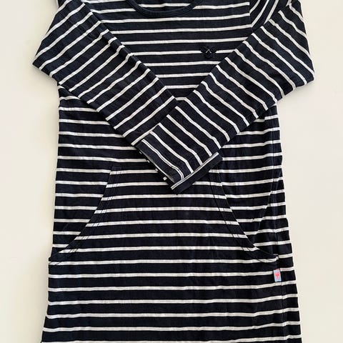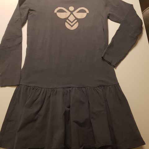 Kjole med lange ærmer, en smal hvid ribkant omkring halsåbningen og kjolens nederste kant. Der er et praktisk bindebånd i livet og 2 lommer fortil. På brystet er der et print af den velkendte Hummel-bi i sølvglimmer.