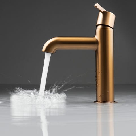 Flot og moderne berøringsfrit armatur i børstet messing og krom sælges. Armaturet har et eksklusivt og tidløst design, som passer perfekt til et stilrent og moderne badeværelse.