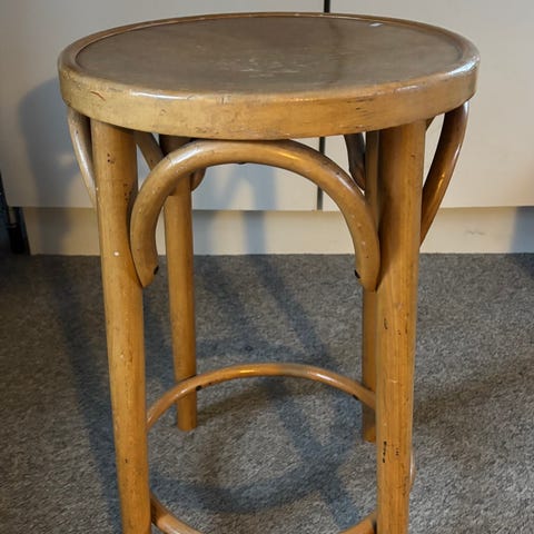 Charmerende retro høj trebenet taburet i træ med sæde betrukket i sort skai. Klassisk dansk design fra de gode gamle dage. God stabil taburet der ikke vakler. Fin stand, dog med få aldersrelateret brugsspor. Mål: H: 71 cm. Ø: 30 cm. Fra ryge - og dyrefrit hjem. Gode P forhold ved afhentning på adressen. Sender ikke. KUN KONTANT VED AFHENTNING.