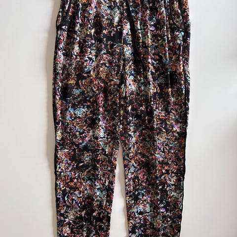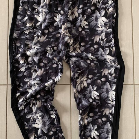 Skønne, blomstrede bukser i et let naturmateriale og løstsiddende design. Bukserne lukkes med lynlås og en knap i livet. Der er en lomme i hver side af bukserne og rynkedetaljer nederst i begge bukseben.