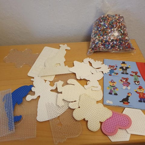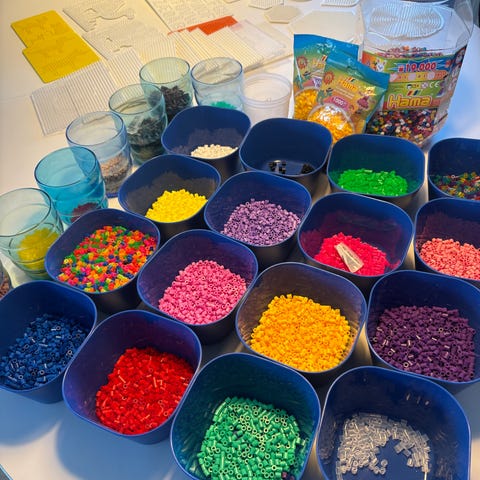 Perleæske indeholdende assorterede farvede perler i flere rum. Perlerne er lavet af plastik og findes i forskellige farver og former, velegnet til hobby- og håndarbejdsprojekter.