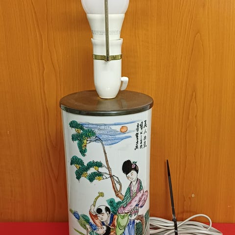 Ældre kinesisk bordlampe af porcelæn kaldes hatstand med Famille Rose polykrom dekoration. Dekoreret med fugl, blomster og skriftstegn. Med messingtop og tænd og sluk på fatning. Stemplet i bund. Mål med skærmstativ: 72 cm. Mål med fatning: 42 cm. Mål: Porcelæn korpus H: 28 cm. Ø:12 cm. Fremstår med aldersvarende brugsspor i messing /se foto nr. 4/, samt med afslag i bunden. Det ses næsten ikke når den står på bordet./se foto nr. 12 og 13/.