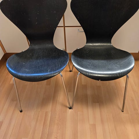 Fritz Hansen Arne Jacobsen Series 7 spisebordsstole i grå farve. Stolene har stel i krom og sæde i formpresset træ. Designet af Arne Jacobsen, kendt for deres ergonomiske form og moderne udtryk. Passer til brug ved spisebord eller som ekstra siddeplads.