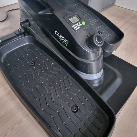 Sort pedal cykel med digitalt display, fodstropper og justerbar modstand. Designet til brug på gulv, egnet til træning af ben. Sælges for under halv pris. Næsten ubrugt.