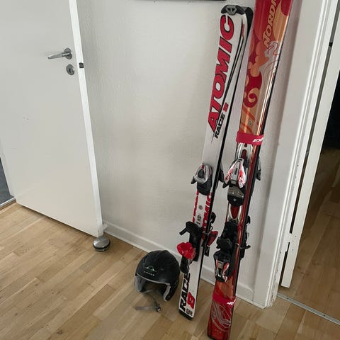 Masser af skiudstyr, både støvler, rygskjold, hjelme, briller, og enkelte par ski tilbage…