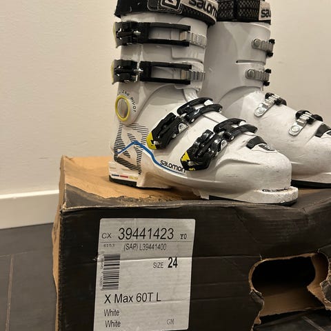 Salomon X Wave 24 skistøvler i størrelse 26,5 cm. Farven er sort med hvide og røde detaljer. Skistøvlerne har fire spænder og er designet til at give støtte og komfort ved skiløb.