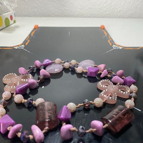 Halskæde i grøn farve bestående af små perler. Designet med sammenflettede perler, der skaber et unikt og dekorativt mønster. Kan anvendes som tilbehør til forskellige outfits.