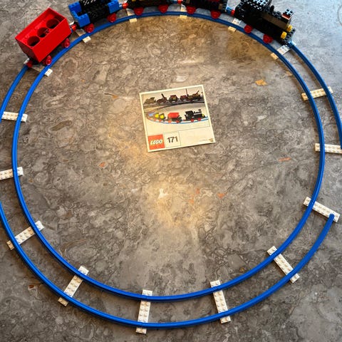 LEGO model fra 1969 med blå skinner og hvide sveller til at lave en rund bane.