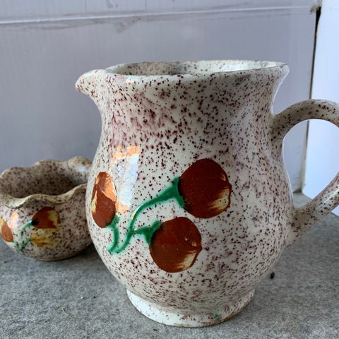 Keramik skål og kande af ældre dato i grønne nuancer, skål 16x8 cm med “øre” og 3 ben, kande af fransk keramik/Danmark, h 22 cm, med hank flot design og glasur , brug feks sættet til dekoration, blomster, lys mv , 1 sæt/2 dele kr 75.-
