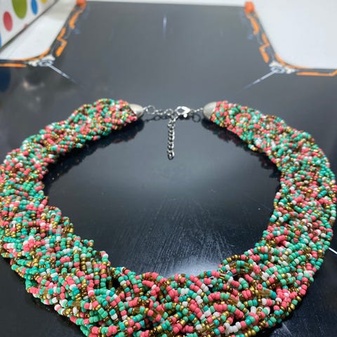 Håndlavet halskæde sammensat af forskellige perler krystaller i lilla og rosa nuancer. Halskæden indeholder perler i flere former og materialer, herunder runde, firkantede og blomsterformede perler. Farverne spænder fra dyb lilla til lys rosa, hvilket giver et varieret og dekorativt udtryk.
