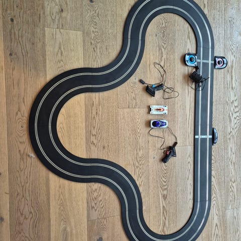 Scalextric racerbane sæt med forskellige banedele inklusive lige stykker, kurver og specialdele. Sættet indeholder også flere racerbiler i forskellige modeller (se billede).