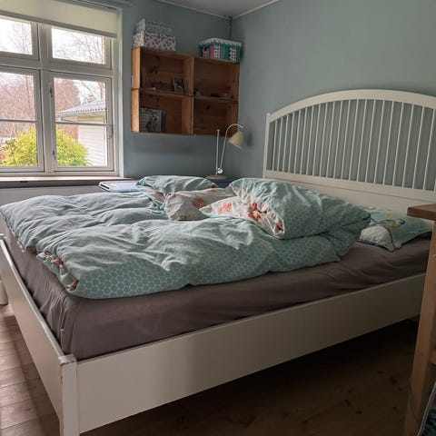 Flot seng med madras og Ikea Tustna topmadras og med flot gavl.