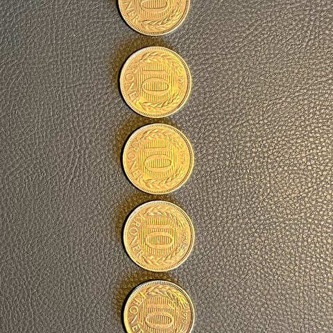 Fire danske 10 kroner mønter fra år 1979, 1981, 1983 og 1985 sælges
