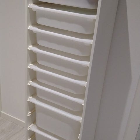 Velholdt og pæn Trofast opbevaringskombination/reol med 6 kasse, 4 låg og to hylder. Så kan man selv vælge kombinationen.