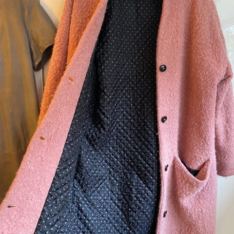 Frakken er lavet i tyk, varm uld og har et meget smukt quiltet inderfor med fine prikker, som giver et luksuriøst og gennemført udtryk. En frakke man kan bruge sæson efter sæson.