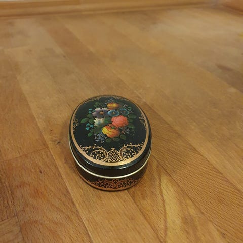 Metal æske med låg.H 6/9 cm, B 10 cm, D 6 cm.Gå til varen, for flere billeder.(Reol 6).