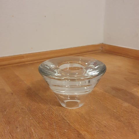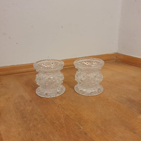 Vintage lysestager i glas.H 18 cm, Bund 11 cm.Sælges som sæt, begge velholdte, uden skår eller lignende. Gå til varen, for flere billeder.(Reol 15).