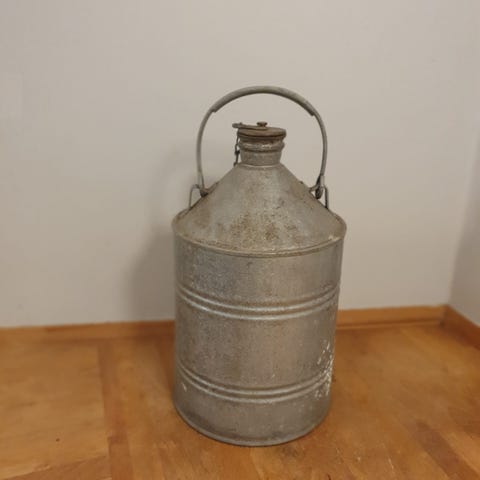 Mælkejunge i metal med låg.H 33/41 cm, Dia 18 cm.Flot og velholdt, gå til varen, for flere billeder.(Stål reol ved dør).