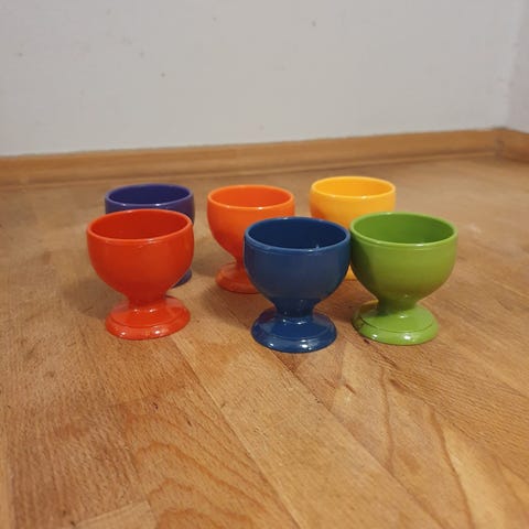 3 stk retro æggebægre i plastik.H 3 cm, B 11 cm, D 9 cm.Sælges samlet. Gå til varen, for flere billeder.(Reol 12).