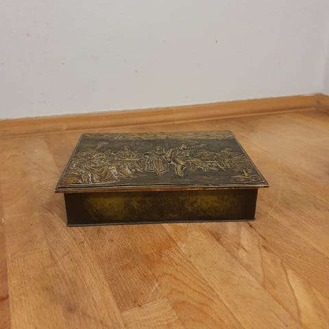 Træ æske med messing hængsel.H 6 cm, B 27 cm, D 15 cm.Hængslet bøjer lidt, gå til varen, for flere billeder.