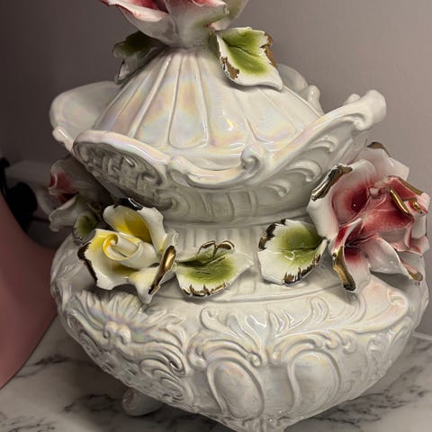 Håndmalet vintage terrin.H 23 cm, B 38 cm, D 26 cm.Flot og velholdt, uden skår. Gå til varen, for flere billeder.(Reol 12).