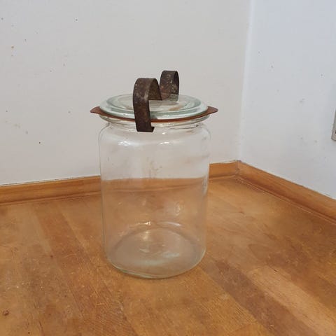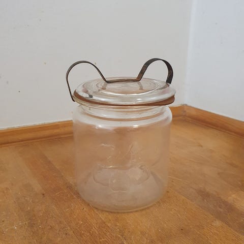 Kastrup/Holmegaard glas med låg og bøjle.H 18,5 cm, Dia 12 cm.1,5 l.Gå til varen, for flere billeder.