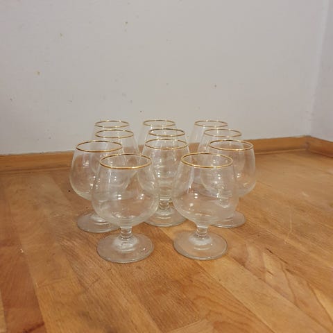 Vintage cognac glas med guldkant, samt mærket med N.H 10 cm, Dia 8 cm, Dia hul 5 cm.Har 8 stk på lager, alle er velholdte. Prisen er stykket, gå til varen, til flere billeder.(Reol 14).