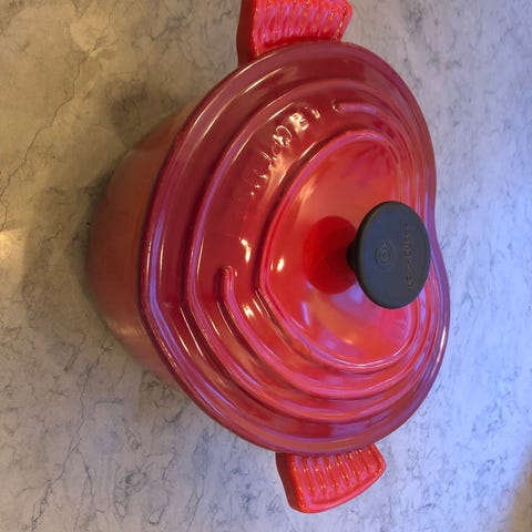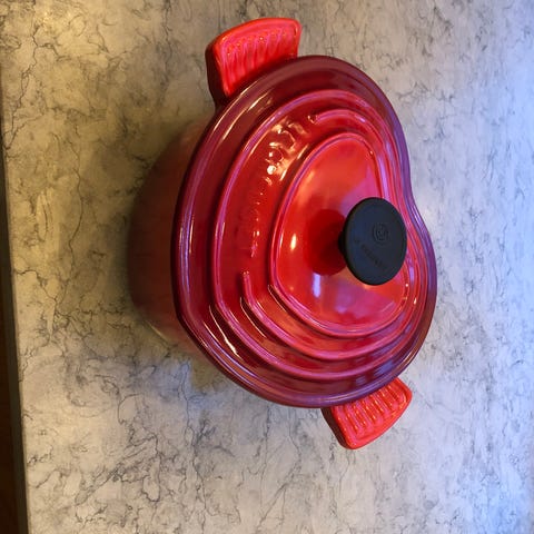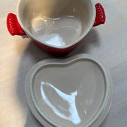 Le Creuset hjerteformet gryde med sort knop.H 16 cm, B 25 cm, D 21 cm.Flot og velholdt, gå til varen, for flere billeder.(Reol 13).