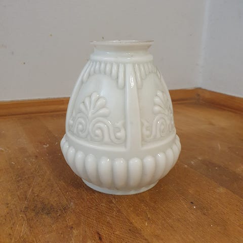 Lampeskærm i hvid opal glas.H 10,5 cm, Dia nederst 15cm, Dia øverst 5,5 cm indvendigt.Flot og velholdt, gå til varen, for flere billeder.(Reol 8).