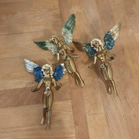 2 små engle.H 13 cm, B 10 cm.Begge velholdte, sælges samlet.(Reol 4).