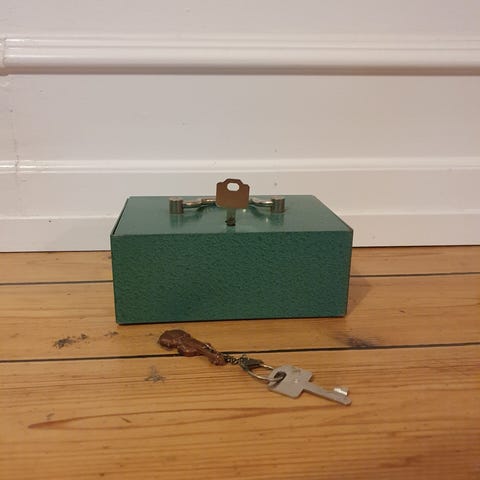 Pengekasse i metal.H 11,5 cm, B 31 cm, D 23 cm.Gå til varen, for flere billeder.(Reol 7).
