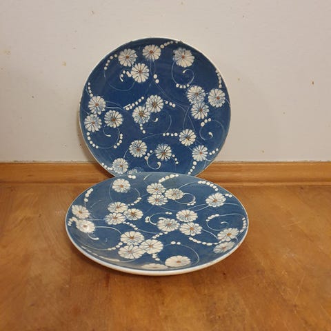 Kähler kagetallerken i blå keramik med blomster.Dia 19 cm.Alle 3 har skår, gå til varen, for flere billeder. Sælges samlet.(Reol 10).