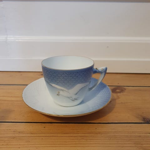 Kop/underkop fra Bing & Grøndahl, Mågestel.1. sortering, nr. 103Kop H 6 cm, Dia 9 cm - Underkop Dia 14 cm.Har 12 styks på lager, prisen er pr. sæt.Flot og velholdt, gå til varen for flere billeder.