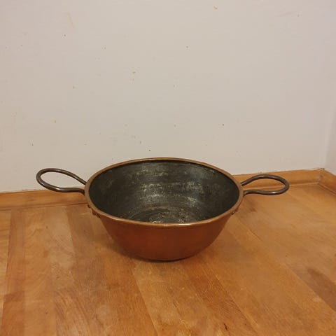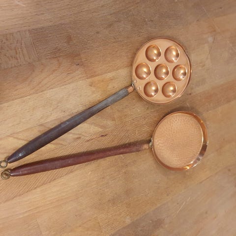 Pander og si i kobber med træ skarft.Dia 15 cm.Den ene mangler beslag til ophæng, gå til varen, for flere billeder.(Reol 4).