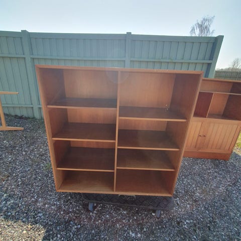 Teaktræs reol på sokkel.H 113 cm, B 101 cm, D 36 cm.Gå til varen, for flere billeder.Møbler står på fjernlager, så efter bestilling, aftales tidspunkt for afhentning/levering. Levering fra 500 kr i Købehavns området til kantsten. Bæres op, to mand, fra 800 kr.