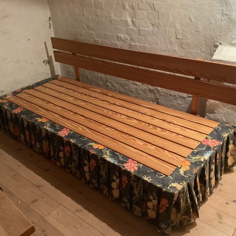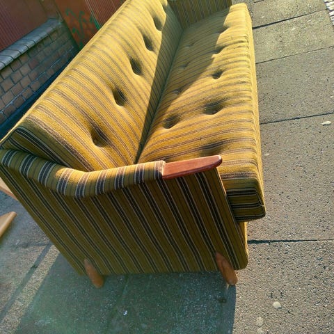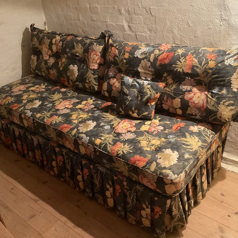 Retro sovesofa med teak ben.H 85 cm, B 190 cm, D 56 cm, i alt d 112 cm.Gå til varen, for flere billeder. Afhentes på Nørrebro, sendes ikke.Fra ikke ryger hjem.