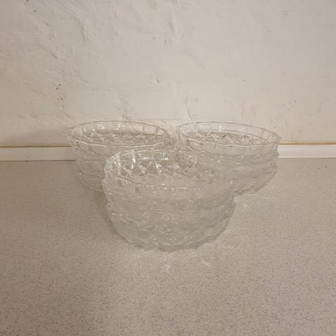 2 stk skåle i glas med slibninger.H 4 cm, B 14 cm, D 10 cm.Skålene har forskellige mønstre, begge velholdte, uden skår. Sælges samlet, gå til varen, for flere billeder.(Reol 9).