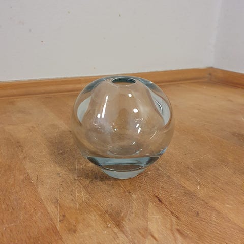 Rød kuglevase fra Holmegaard.H 15 cm, Dia 13 cm, Hul dia 5 cm.Har en lille ridse, gå til varen, for flere billeder.(Reol 9).
