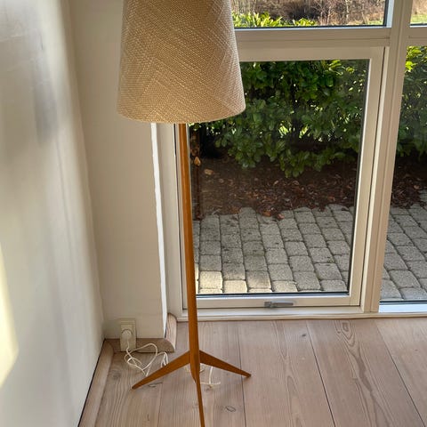 70'er lampe i teaktræ med lampeskærm.H 154 cm. Skærm dia 34 cm.Flot og velholdt, gå til varen, for flere billeder. Kan afhentes på Nørrebro efter aftale, sendes ikke.(N).