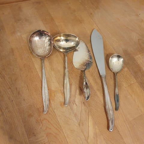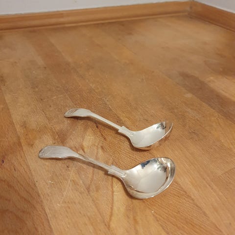 Gaffel og ske i pletsølv.L 20 cm.Sælges samlet, gå til varen, for flere billeder.